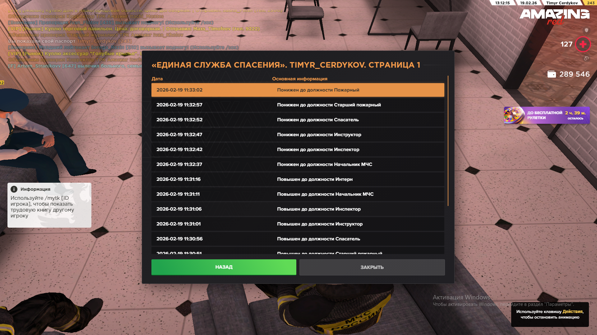 Докладывает, я Старший пожарный МЧС, Никита Грифович Никитов, за время выполнения обязанностей в период с 14.02.2026 до 18.02.2026, мной была проделана следующая работа для предоставления к повышению в должности: